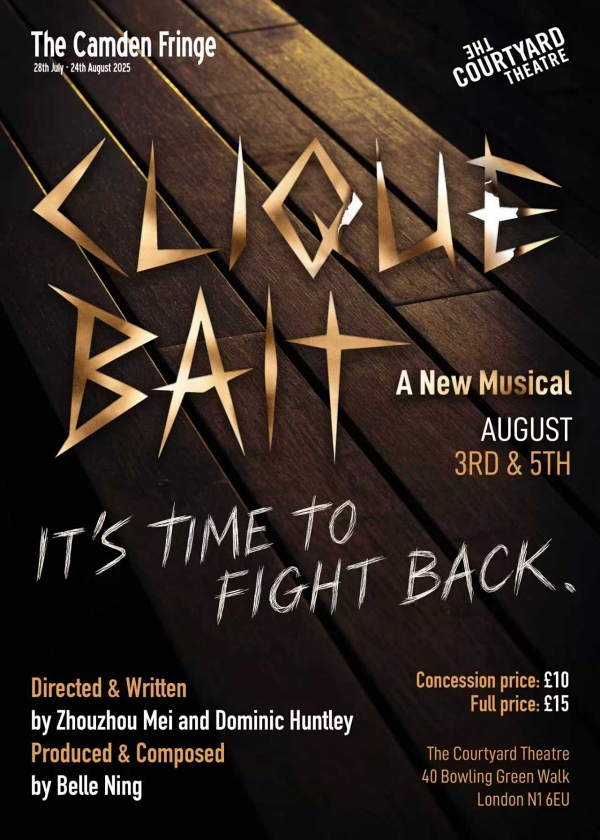 Clique Bait is a bold new musical that dares to expose the dark undercurrents of cultural tension, bullying, and resilience in the UK’s performing arts scene. Written by Zhouzhou Mei and Dominic Huntley, the show is set at a fictional elite dance and drama academy in London, following Nini, a young Chinese student with dreams of stardom—until her classmates turn on her. Betrayed by both Western and Asian peers, Nini is pushed to the brink and forced to reclaim her dignity in the face of cruelty, manipulation, and institutional silence.